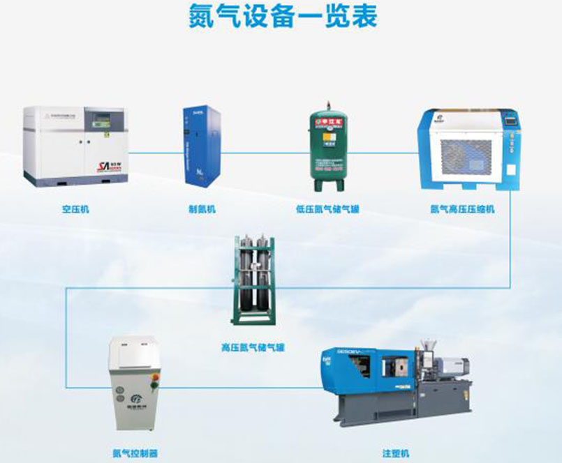 公司氮气设备产品有:氨气压缩机、氮气制造机、氨气控制器(单阀、双阀)、氨气模具气针、模具高压连接配件等。
